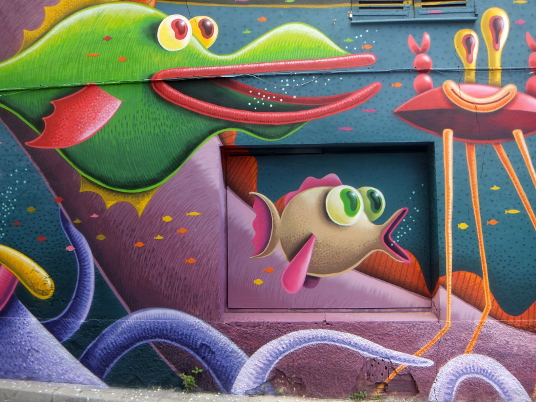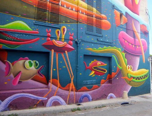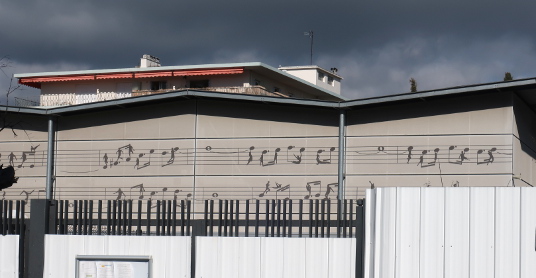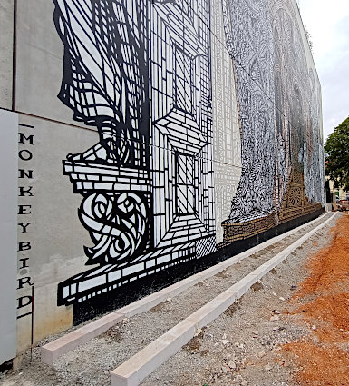 NUITS CARRÉES 2.5.2 Reviewed by ANDRE BEAUMONT The mural by Parisian street artist Nicolas Barrome Forgues was unveiled by the mayor of Antibes on 21 June 2018. It was created in association with the Nuits Carrées street music festival a week later and the collective 2.5.2. As external murals rarely survive long in pristine condition and the photographs were taken three weeks after, the work is recorded here. ***** ![]() Maybe you have to grant a certain musical rationality to the parsing of architecture ![]() 16th edition will take place in its new location, no longer at the Fort Carré but between the ferris wheel and the carousel, by the port ![]() Toutes les couleurs ![]() Conservatoire and theatre lie beyond ![]() Their artists include Monkeybird below: ![]() Permanent mural by the stencil artists with adjacent landscaping underway for the public gardens ![]() Couldn't resist a drop of the pun |