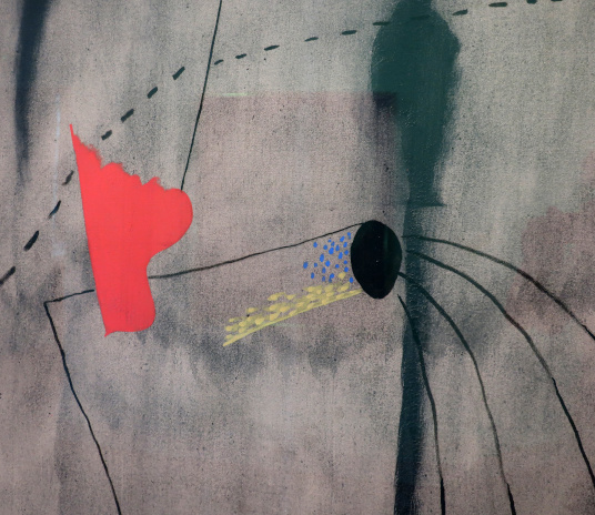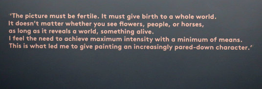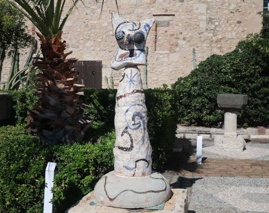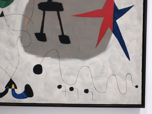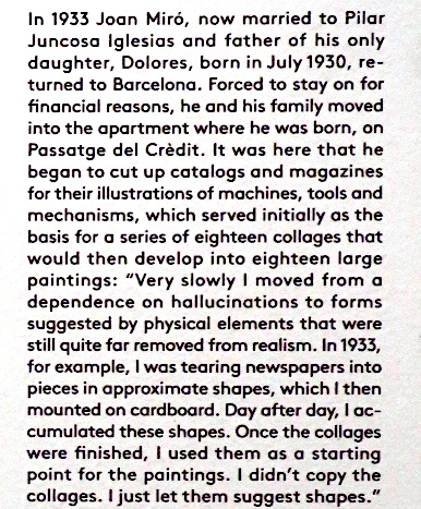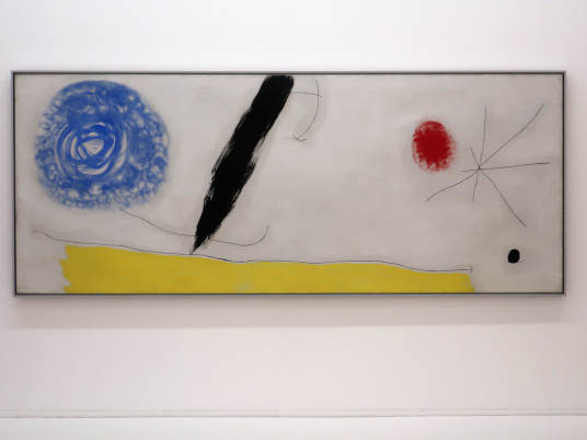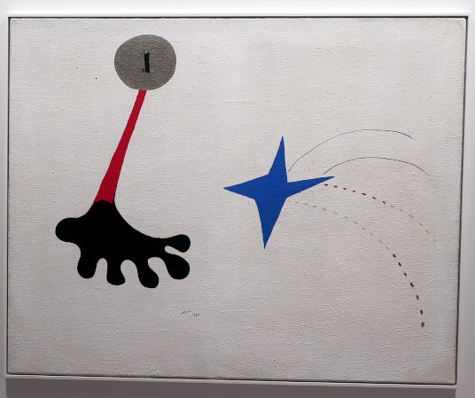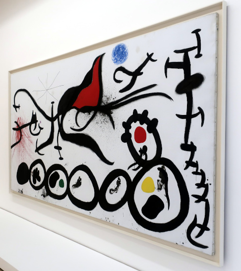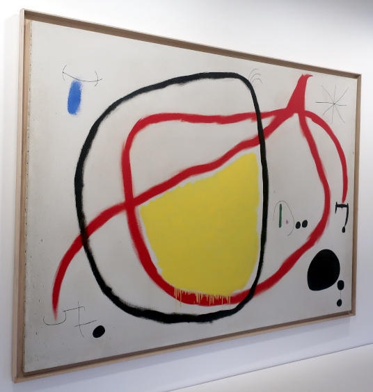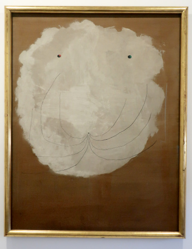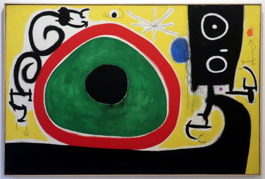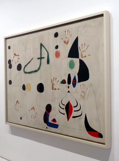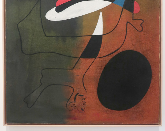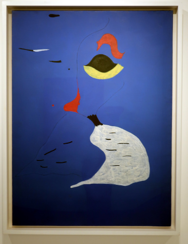 JOAN MIRÓ'S DOZEN Reviewed by ANDRE BEAUMONT The exhibition, Joan Miró - Chefs-d'oeuvres de la Collection Namad, at the Picasso Museum in Antibes, 30 June - 27 October 2024, features twelve paintings from the private collection, one or two per room only, for maximum impact in architectural space. I will start with a painting of 1933 as it adds a perception further to his methodology, in his own words. It also features the unusual brown grounds he used. His suggestion of form comes first from collage. Peinture, 5 juin 1933 From 1967-68 there can be found paintings of the bird series, a few perhaps hurried along to make the major retrospective of his work, to mark his 75th birthday, at the Fondation Maeght. A canvas from 1968 is Oiseau en fête pour le lever du jour, which seems to reference collage technique by bordering forms with a white ground. In the same room as the 1933 canvas with the brown ground is the 1925 canvas below that echoes Toulouse Lautrec in the trickling black on the left and his friend Calder elsewhere. Peinture, 1925 This is a powerful work that gets away from the easy viewing that makes him so readily popular. It is his command of space, placing of objects, insertion of colour and use of grounds that is so appealing to others who do not just want easy viewing. The appearance of red above is like something that happens in collage. Peinture (femme au chapeau rouge), 1927, uses an ultramarine ground and Le chat blanc, 1927, uses a brown ground, with the friendy face commanding space in a way cat portraiture rarely does and ushering in the lovely gradation of brown on canvas. Femme, étoiles, 1945 His 1945 painting, above, is enigmatic as to Miró symbols and displays combinatorial success in overlaps. Femme dans la nuit, 1945, using white-gray (over brown?) ground is less successful - the command of space would have been better without the experiment of the artist's palm prints. Returning to the late bird theme paintings there are two rather good ones. Oiseau dans la nuit, 1967 Le vol de l'oiseau par le clair de lune, 1967 In the upper painting the morning sun's rays bleed into the red delineation, the opposite of what could happen in collage. In the lower one the red moon (not painted red) is properly delineated by black against a glorious green ground. Only the bird has white delineation around it, giving it motion. The largest two bird paintings, below, are from 1968, the first from January, the second from April, with impossibly long French titles best shorthanded to 'bird woken by the cry of the blue sky' and 'difficult path trodden, guided by the bird of the desert'. ' The emotions are there for both. Can we predict the future? With difficulty. Can an artist pre-sense the future? Probably, as they work with distilled reality. They are the best weathervane. The clear blue sky of January soon to turn into the protest of May 1968? Maybe. The symbols turn from calm to troubled. You leave the exhibition back in the easy playfulness of early work (1927). Out on the ever popular terrace amongst the permanent colllection you will find .... La Déesse de la Mer (Joan Miró with Josep Llorens Artigas, 1968) |