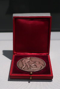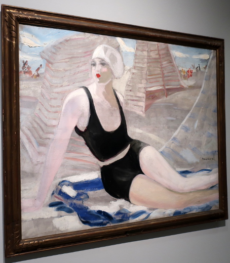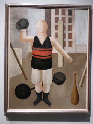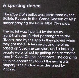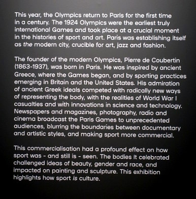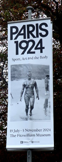 PARIS 1924 Reviewed by ANDRE BEAUMONT The exhibition Paris 1924 Sport, Art and the Body at the Fitzwilliam Museum is a truly well balanced show and educative about the first Paris Olympics, echoed a century later by the Paris 2024 Olympics and Paralympics. There are the historical, sporting, cultural, commercial, local, global and artistic aspects all covered in one. Introductory wall text André Lhote, Tennis Players, 1917 Alexandre Calder, Helen Wills, 1927. After her win in 1924 her white visor became the rage on the Côte d'Azur After a false start trying to get to the preview, I eventually saw the exhibition after the Olympics were over in Paris. The Olympics was not all about sport so there is a surfeit of possible review material. 1924 was in the steam age but the steam age continued longer in France than in Britain and, as a child, we used to travel down to the Côte d'Azur first class on the night train hauled by the biggest locomotives. You might wake in the dead of night to the shouts of platform railmen and feel the shunt as it stopped at Lyon to change locomotive before pressing on. Theoretically it was still possible to go by the blue train but it was on its way out and it only ran once a week. So having just steamed down there and having been exposed to a lot of modernist art [1], this review will mainly cover the contemporary and modernist art rather than the sport. Most of the art in the exhibition is not from 1924 itself but expands on the themes of the changing nature of sport and its influence on culture. Jack Butler Yeats, The Liffey Swim, 1923 - expressionist rather than modernist Pablo Picasso, The Wrestlers, 1921, lithograph - modernism drew so much from antiquity It was the time of the birth of modernism. W.B. Yeats had won the Nobel Prize, T.S. Eliot had published The Waste Land and Le Corbusier Vers Une Architecture. Le Corbusier, Vers Une Architecture, 1923 Jeanne Rij Rousseau The Wrestlers, 1924 Will Baumeister, Female Runner II, 1925 Umberto Boccioni, Unique, Forms of Continuity in Space, sculpted 1913, cast 1972 Futurist, supposedly a footballer, evokes a groundbreaking take on medieval armour Jacqueline Marval, Bather in a Black Swimsuit, 1920-23 - this moves us into another century so well from, say, Boudin's depiction of bathers at Deauville [2] Robert Delauney, Runners, c.1924 - post-Olympics, the heads echo the Olympic rings Enzo Benedetto, Cyclist, 1926 - could as well be a 2020s portrayal George Grosz, The Gymnast, c.1922 - the simplicity of the background architectural forms precede Mies van der Rohe's architecture in clear space Futurist - unlike Paris 1924, a world not yet at peace with itself, shown in excellent art Gino Severini, Danseuse V, 1914-15 |