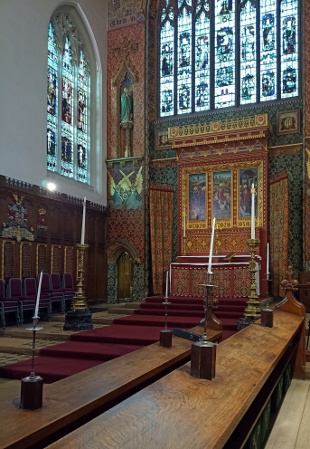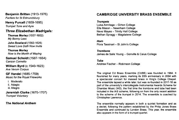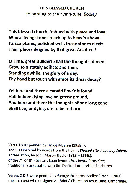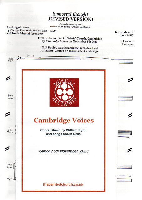 GEORGE FREDERICK BODLEY Reviewed by ANDRE BEAUMONT All Saints' Church is a Grade I listed church by the Victorian architect, George Frederick Bodley. Having recently been the venue for a Coronation Celebration on 7 May 2023, it hosted its own first jubilee event on 22 July 2023, when I attended a performance by the CSD Brass band. This is now a vigorously used venue for music and, as observed at the May event, the acoustic of the church suits brass well. I have elsewhere commented on hearing organ pipes through the flagstones, floors, seats and pews of churches [1] and there was so much brass on show that the pews resonated even more. I am fairly used to hearing pipes and the conductor explained to the audience the lengths of all the B flat and E flat instruments but I guess there is one difference: the pews here are screwed down through floorboards whilst in somewhere like Westminster Abbey there are flagstones. It does show that a Victorian architect like Bodley had honed down making a great church with an economy of materials. You walk on tiles where there is most traffic. Wood usually gives a much different acoustic to stone. It is the Victorian decoration that many admire but there is much craft to church design if you want it to last the test of time as, indeed, shown by those who did the restoration. There were some interesting instruments on show like a flugelhorn, a cornet section and a baritone euphonium. The jubilee theme was carried through the programme, to the extent that was realistic. It is also the 400th anniversary of William Byrd's death so we started with an adaptation of the Agnus Dei for 5 voices. It is the 100th anniversary of the Disney Corporation so there was something from Repunzl's Tangled Adventure and Ghost Riders in the Sky. ![]() The CSD Brass band at All Saints' Church ![]() There was the 6/8 time march Blaze Away, Whitney Houston's One Moment in Time, Ennio Morricone's The Mission with a cornet taking the part of an oboe, the Twelfth Street Rag and the cornet section playing the ragtime Buster Strikes Back. There was some contemporary composition and, indeed, much more. ![]() ![]() The church was packed .... with children over 50 ![]() The programme for the Coronation Celebration the day after the coronation ![]() The other G.F. Bodley church and interior in Cambridge, the listed Queens' College Chapel [2] ![]() I was impressed by this school of drama's end of term day out in Cambridge and here you did get children - but so skilled you would never know - I always did think brains worked best at 17 ![]() With the pews temporarily vacated by the Contemporary Choir ready to perform, here was packed, too - the other choirs are the Chamber Choir and the Consort of Voices ![]() The Cam from the mathematical bridge at Queens' On 5 November 2023 I returned to All Saints' Church to a concert by Cambridge Voices whose final piece was a commissioned hymn from Ian de Massini incorporating a poem by George Frederick Bodley. ![]() We were generously provided with the score as well This was a splendid song by a very talented choir to conclude the programme. It was the only one accompanied by the 1864 Foster & Andrews organ, an organ in original condition which I had only heard in recitals before. There is evidence that Bodley thought a lot about the sound of the organ, which is contemporary to his design, and hearing it accompanying church music is what was intended all along as it does not have the long pipes of organs installed with recitals in contemplation. ![]() The organ section of the hymn was glorious leaving me wanting an organ voluntary as we left the church. Here we have an opening though - perhaps Ian de Massini and the Cambridge Voices (or others) could come back to perform church music that is accompanied by the organ, with organ voluntaries - which were originally conceived to entertain the congregation - thrown in beginning and end? Then we will really hear the organ as Bodley intended. |