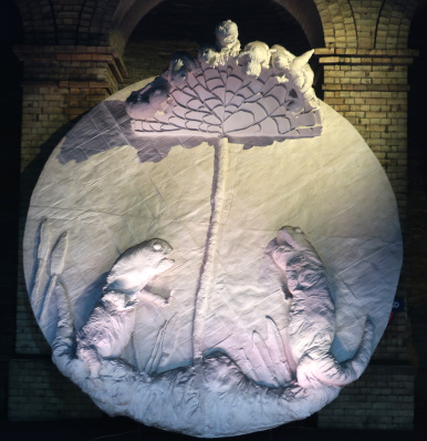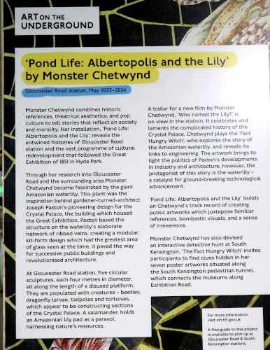 Installing art on the Underground has always been about merging it with practicality. Here the electricity socket, fortuitously, is where the frog's heart should be which leads us to what was the beating heart of the railway, Lots Road power station, not terribly far from Gloucester Road Station where the exhibits are.