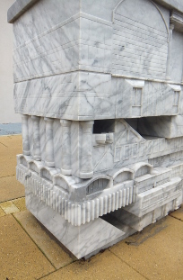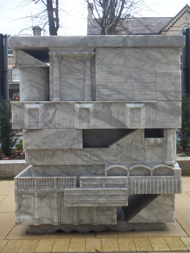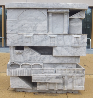 LEAN TO Reviewed by ANDRE BEAUMONT I walked past this sculpture yesterday in the drizzle and immediately thought it the best permanent outdoor sculpture to arrive in Cambridge this decade and perhaps very much longer. Overcast or no, I have come back today for the photos and, as with most sculpture, I had to learn on the go - I did not know of the sculptor. ![]() ![]() ![]() ![]() The work is entitled Lean-To and combines architectural sections and elevations melded into a whole in marble. I much appreciate it being in marble. We get Parthenon friezes in marble, caryatids, funerary ornaments and war memorials - all in marble - but not scale models of architectural fantasies. It is striking in its originality. It is by Shezad Dawood and was installed in Station Road in 2024. |