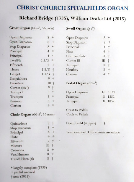 FROBENIUS ORGAN, ROBINSON COLLEGE Reviewed by ANDRE BEAUMONT On 20th January 2018 I went to listen to a recital of Italian baroque organ music on the Frobenius organ in Robinson College Chapel. The music was sourced from the Fitzwilliam Museum's Collection. The recital was given by Gerald Gifford who voiced the organ, played it at the formal opening of the college by H.M. The Queen in 1981 and at its inaugural recital. He is honorary Keeper of Music at the museum. I had not heard it before nor most of the music. It is a bright organ with no really long pipes so the organist's arrangements and registration to facilitate the playing of baroque music were appreciated. The architecture furnished an inspired way of creating an organ loft. There is little of the type of reverberation you get in a church. Most of the sound comes straight at you but it might vary depending on where you are and which way you are facing. With the sloping roof it is inevitably lopsided with something different coming to each ear though not really in timing. I only sat in one spot but angling your head could alter what you heard. High noted pieces can turn out really charming because the sound comes in a direct path to you without the intermediation of reflections. I'm mischieviously coming to the conclusion that getting an organist to help an architect tweak the acoustics of a room might be a better than using some engineering firms. There are some dreadful sounding spaces in academic buildings which end up sounding more like train stations or where you can hear everyone's conversation. This was an enjoyable concert with different music other organists might like to explore. Programme front page ___________________________________________________________________________ On 7 May 2019 I attended another unusual programme of music at a recital by Enrico Presti given on the Parish organ of Great St Mary's. Programme front page When there is precision of resonance from an organ there is something that feels health giving about it; others have said the same about good audio equipment but this is unamplified live music. Our brains probably measure time interval very accurately and when you also vibrate to the sound there is something added. I was impressed by Enrico Presti's registration, bringing out of the lower registers of the organ and precision of playing that made this the most enjoyable recital I have heard on this organ in the past two years. It is not emotion this time - everyone has their own style - it was that the sound was right, the air was right and the reviewer was suitably rumbled and rattled in his pew, which is not always the case with this organ. The first composition may be a little hard work listening to, not because of the organist, but from the second I was captured, particularly by the resonance of bass notes. Two of the compositions may be based on Bach but this was nothing like baroque music; composition runs from 1859 to 1982 and suited this organ. The Ferenc Liszt, Bossi and Certani I was particularly impressed by. Leaving Great St Mary's lunchtime recital ___________________________________________________________________________ To conclude I thought I would go to listen to Stephen Farr again at the evening recital on 25 November 2019 at Christ Church Spitalfields. ![]() Old 120 film snap In the early eighties I used to be a Friend when it was in terrible condition inside and a little under threat. Certainly, there was no functioning organ and it would have been dangerous to let the public in. The quality of the internal finishes visible now as a result of restoration is astonishing. It is one of the Grade I listed jewels of English architecture. We met another Friend on the steps at the time, a Lloyds underwriter, and as result I was invited to write a review of the Lloyd's Building, recently opened, reproduced marginally changed on World Reviews, now also Grade I listed. At the time, I was the only one who described it as revolutionary for English architecture. Wonderfully, it has not been subject to disfiguring modifications and there are always City people game for preserving heritage. I like Boris buses; I find the design elegant but mine was held up by the new prime minister's car coming the other direction so I arrived 5 minutes after the start of the recital. The photo of Stephen Farr at the organ was hastily snatched from then. The organ was rebuilt in 2015 with many new pipes and he is one of the best at bringing out an organ's capabilities as he did in a varied programme. I was hoping to get round more of Cambridge's organs during the year. He played Walther's Concerto del Sigr Torelli here at Spitalfields in a recital spanning 8 composers but if you would like to hear him play on the organ of Clare College there is a recording of him playing Walther there. |