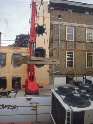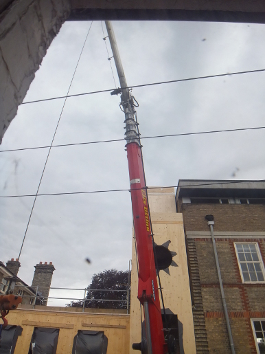 The crane operator may not be going to break anything, like the window, but this is not the designated place to be loading by. It is cutting corners on a Friday evening because this timber could have been taken out by the usual route. The timestamps on the photographs should be about 75 minutes before those marked, in other words about 15.51. |