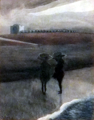 SHORELINE OSTEND Reviewed by ANDRE BEAUMONT Léon Spilliaert, Hofstraat, 1908 Ostend has the most memorable of two mile shorelines facing the North Sea. I arrived one September afternoon, tourists gone, and stayed for three days. Walking back a little uphill seaward, almost parallel to the Visserkai in the gathering gloom to find a restaurant it felt just like the painting above with a mild gale blowing up. View from artist's studio on the Visserkai, 1908-09 Woman on a stool, 1910 Although there is a lot else to Spilliaert that gives an education in his stripped down style linked to the literary Symbolists I came to the Royal Academy's Léon Spilliaert exhibition with one objective in mind - to see his art that so accurately recreates the emotions produced by that shoreline. Spilliaert's wife, Rachel - Needlework, 1917 He was born, brought up, married and spent the greater part of his life in Ostend. Girls on the beach, Royal Palace Hotel, 1908 The colour temperatures in the exhibition rooms varied so much even within rooms and there were so many reflections off exhibits that impromptu photography is not a reliable indicator of what was there but that is not the purpose of an exhibition so you really must go to see it to view the detail. It will be a rewarding visit as it is very fine in execution. Returning from a swim, 1907 A century on, no more trees but imagine just the posts and no buildings Neoclassical repetition The Royal Galleries, 1908 Fisherman's wife on a jetty, 1909 Storm at sea, 1908 Woman on the shoreline, 1910 The gust of wind, 1904 Trophy in the wind |