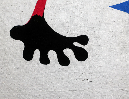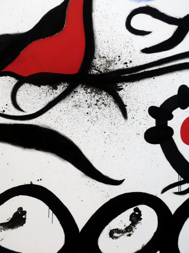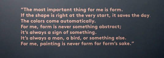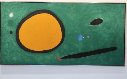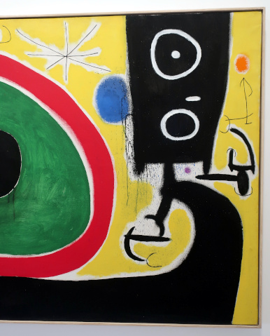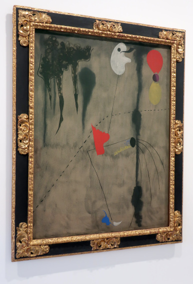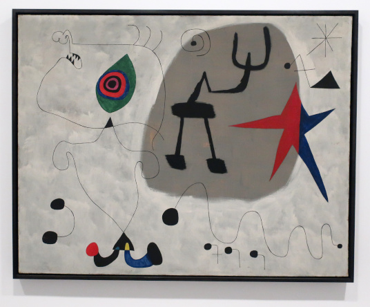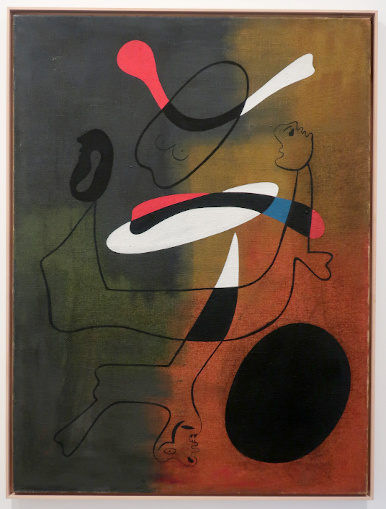 JOAN MIRÓ'S DOZEN Reviewed by ANDRE BEAUMONT The exhibition, Joan Miró - Chefs-d'oeuvres de la Collection Namad, at the Picasso Museum in Antibes, 30 June - 27 October 2024, features twelve paintings from the private collection, one or two per room only, for maximum impact in architectural space. I will start with a painting of 1933 as it adds a perception further to his methodology, in his own words. It also features the unusual brown grounds he used. His suggestion of form comes first from collage. Peinture, 5 juin 1933 From 1967-68 there can be found paintings of the bird series, a few perhaps hurried along to make the major retrospective of his work, to mark his 75th birthday, at the Fondation Maeght. A canvas from 1968 is Oiseau en fête pour le lever du jour, which seems to reference collage technique by bordering forms with a white ground. In the same room as the 1933 canvas with the brown ground is the 1925 canvas below that echoes Toulouse Lautrec in the trickling black on the left and his friend Calder elsewhere. Peinture, 1925 This is a powerful work that gets away from the easy viewing that makes him so readily popular. It is his command of space, placing of objects, insertion of colour and use of grounds that is so appealing to others who do not just want easy viewing. The appearance of red above is like something that happens in collage. Peinture (femme au chapeau rouge), 1927, uses an ultramarine ground and Le chat blanc, 1927, uses a brown ground, with the friendy face commanding space in a way cat portraiture rarely does and ushering in the lovely gradation of brown on canvas. Femme, étoiles, 1945 His 1945 painting, above, is enigmatic as to Miró symbols and displays combinatorial success in overlaps. Femme dans la nuit, 1945, using white-gray (over brown?) ground is less successful - the command of space would have been better without the experiment of the artist's palm prints. Returning to the late bird theme paintings there are two rather good ones. Oiseau dans la nuit, 1967 Le vol de l'oiseau par le clair de lune, 1967 In the upper painting the morning sun's rays bleed into the red delineation, the opposite of what could happen in collage. In the lower one the red moon (not painted red) is properly delineated by black against a glorious green ground. Only the bird has white delineation around it, giving it motion. The largest two bird paintings, below, are from 1968, the first from January, the second from April, with impossibly long French titles best shorthanded to 'bird woken by the cry of the blue sky' and 'difficult path trodden, guided by the bird of the desert'. ' The emotions are there for both. Can we predict the future? With difficulty. Can an artist pre-sense the future? Probably, as they work with distilled reality. They are the best weathervane. The clear blue sky of January soon to turn into the protest of May 1968? Maybe. The symbols turn from calm to troubled. You leave the exhibition back in the easy playfulness of early work (1927). Out on the ever popular terrace amongst the permanent colllection you will find .... La Déesse de la Mer (Joan Miró with Josep Llorens Artigas, 1968) |