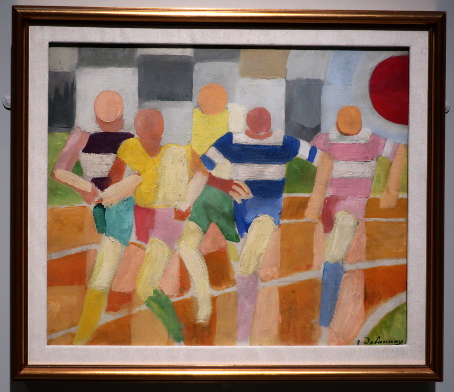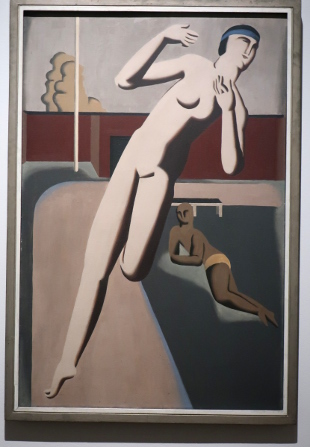 PARIS 1924 Reviewed by ANDRE BEAUMONT The exhibition Paris 1924 Sport, Art and the Body at the Fitzwilliam Museum is a truly well balanced show and educative about the first Paris Olympics, echoed a century later by the Paris 2024 Olympics and Paralympics. There are the historical, sporting, cultural, commercial, local, global and artistic aspects all covered in one. Introductory wall text André Lhote, Tennis Players, 1917 Alexandre Calder, Helen Wills, 1927. After her win in 1924 her white visor became the rage on the Côte d'Azur After a false start trying to get to the preview, I eventually saw the exhibition after the Olympics were over in Paris. The Olympics was not all about sport so there is a surfeit of possible review material. 1924 was in the steam age but the steam age continued longer in France than in Britain and, as a child, we used to travel down to the Côte d'Azur first class on the night train hauled by the biggest locomotives. You might wake in the dead of night to the shouts of platform railmen and feel the shunt as it stopped at Lyon to change locomotive before pressing on. Theoretically it was still possible to go by the blue train but it was on its way out and it only ran once a week. So having just steamed down there and having been exposed to a lot of modernist art [1], this review will mainly cover the contemporary and modernist art rather than the sport. Most of the art in the exhibition is not from 1924 itself but expands on the themes of the changing nature of sport and its influence on culture. Jack Butler Yeats, The Liffey Swim, 1923 - expressionist rather than modernist Pablo Picasso, The Wrestlers, 1921, lithograph - modernism drew so much from antiquity It was the time of the birth of modernism. W.B. Yeats had won the Nobel Prize, T.S. Eliot had published The Waste Land and Le Corbusier Vers Une Architecture. Le Corbusier, Vers Une Architecture, 1923 Jeanne Rij Rousseau The Wrestlers, 1924 Will Baumeister, Female Runner II, 1925 Umberto Boccioni, Unique, Forms of Continuity in Space, sculpted 1913, cast 1972 Futurist, supposedly a footballer, evokes a groundbreaking take on medieval armour Jacqueline Marval, Bather in a Black Swimsuit, 1920-23 - this moves us into another century so well from, say, Boudin's depiction of bathers at Deauville [2] Robert Delauney, Runners, c.1924 - post-Olympics, the heads echo the Olympic rings Enzo Benedetto, Cyclist, 1926 - could as well be a 2020s portrayal George Grosz, The Gymnast, c.1922 - the simplicity of the background architectural forms precede Mies van der Rohe's architecture in clear space Futurist - unlike Paris 1924, a world not yet at peace with itself, shown in excellent art Gino Severini, Danseuse V, 1914-15 |