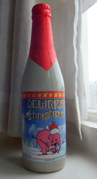 DELIRIUM CHRISTMAS Reviewed by ANDRE BEAUMONT Delirium Christmas comes in an attractive faux earthenware bottle. It has 10% alcohol - which makes it stronger than Mosel riesling at around 8%, which you can drink all day with no ill effects if it is any good. If you happen to drink it on an empty stomach on Boxing Day, Delerium Christmas has excellent hoppiness with no unpleasant congeners like cheap port so there are no ill effects. Its bitterness goes excellently with neat Stilton, which you won't be getting usually in Belgium .... or the Mosel valley for that matter. Neither comes close to overwhelming the other so you can substitute it for port. It has an orange-red colour and once poured produces a copious dark cream head. It has very vigorous carbonation which can come back up through the nose, which is intriguing but you get the flavour better. As for actual nose there are numerous fruits but for myself I prefer not to describe beverages by their fruits as the comparisons do not produce exact matches on my nose - but everyone's nose and palate is different. It is dry and bitter, and long in the mouth, and the alcohol is not aggressive on the mouth or the palate. It changes a bit with time in the glass but at both ends it has quality, with fizz at the front end and, as some of the still strong carbonation goes towards the end of the glass, more pronounced alcohol. It still leaves carbonation legs on the side of the glass towards the end - the equivalent of the alcohol legs for the Chablis I had for Christmas with guinea fowl. The last 2 centimetres of liquid in the bottle produces a 3 centimetre head after half an hour. You will run out of Stilton before you run out of fizz. It has character in flavour at the top of the palate and is much better than most beers for Christmas. |