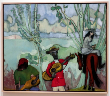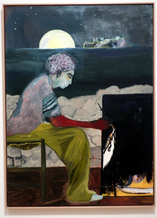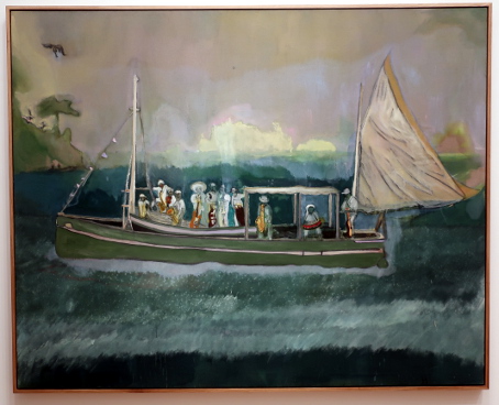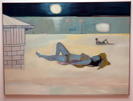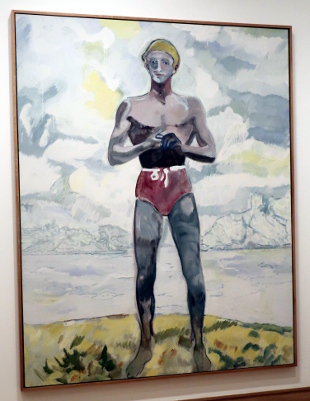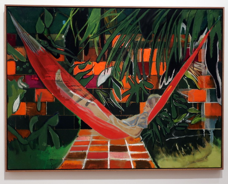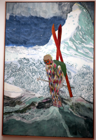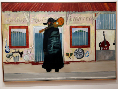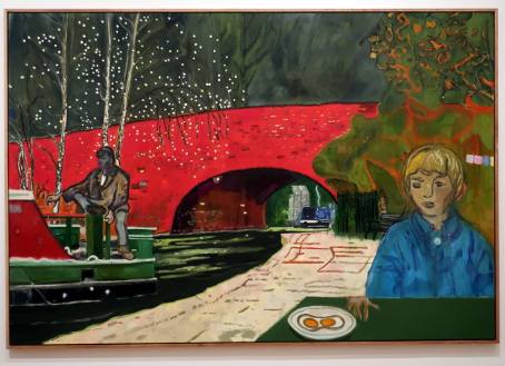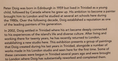 PETER DOIG AT THE COURTAULD Reviewed by ANDRE BEAUMONT The artist creates with his own emotions. The public comes with its own. Peter Doig is an enigma. One who learnt to be fashionable fast. In the mid-eighties I was briefly an art critic alongside other things. I particularly liked going to one gallery in Cork Street. In this time he had two shows there. At the first show I did not like his work. The emotions within were sombre and did not access mine. Liking was not, however, a block to recognizing that he could become an important artist. I had resolved not to buy art in parallel. At the second show I stopped short at one painting. I really should buy that. I can afford it. It was more abstract, lighter and lighter in tone. I should have asked to see the artist. Then I made the excuses: I do not have the floor to ceiling height to properly hang it; it would cost me over a month's pay. When recently I heard that some of his canvasses sold for tens of millions, I was not unpleased for an artist I had never met. When the Courtauld show came on the radar I had to go. At the show itself the fact that virtually all the paintings were, it appears, completed from 2019 to 2023 rang a discordant bell. It would be what a commercial gallery would present and there were relatively few paintings. Like a musician singing live only from the latest album when quality or audience favourites suggest another line; is he doing that under outside influence? However, the artist has at times been off the radar and has recently relocated to Britain so this view of his work may be what he wants to push. I am all for what the artist wants; commercial chaff degrades artistic integrity. I think I have imperfect images of all of them below. The paintings are more representational than in the eighties if in partly imagined spaces, larger, better executed, mainly on linen and employing a tropical colour palate. The emotions are still the enigma. There are plenty of them from the artist but watching the other viewers go round the exhibition a little bemused as to what to make of the paintings he is still not accessing theirs early. (They are large paintings and a screen delivers small images which may make it easier to relate to them.) Yes, I like them. ![]() House of Music (Soca Boat) ![]() Music Shop ![]() a London scene with the artist's son ![]() Alice at Boscoe's (the artist's daughter) ![]() Music 2 Trees - (with the artist's wife) ![]() ![]() detail from Self Portrait (Fernandez Compound) ![]() Painting on the Island Carrera (the hair is three dimensional) ![]() ![]() The Alpinist ![]() Night Studio (Studiofilm and Racquet Club) - this painting is from 2015 and different in kind ![]() exhibition wall text |