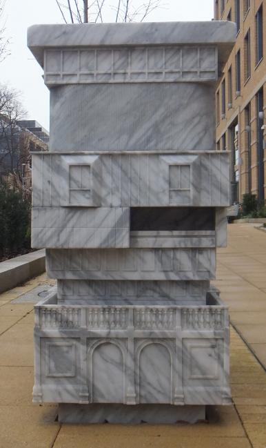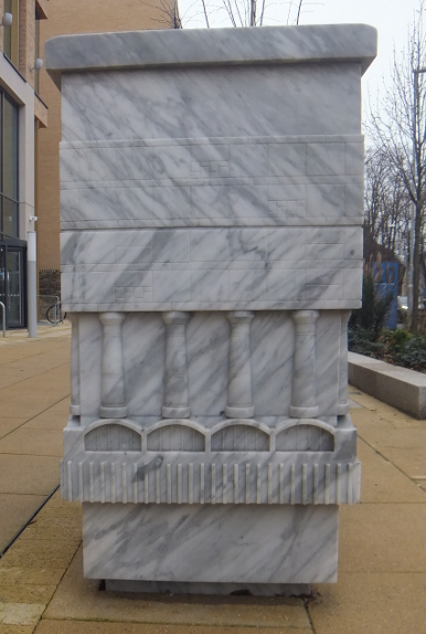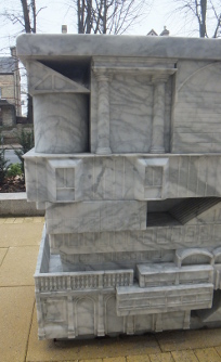 LEAN TO Reviewed by ANDRE BEAUMONT I walked past this sculpture yesterday in the drizzle and immediately thought it the best permanent outdoor sculpture to arrive in Cambridge this decade and perhaps very much longer. Overcast or no, I have come back today for the photos and, as with most sculpture, I had to learn on the go - I did not know of the sculptor. ![]() ![]() ![]() ![]() The work is entitled Lean-To and combines architectural sections and elevations melded into a whole in marble. I much appreciate it being in marble. We get Parthenon friezes in marble, caryatids, funerary ornaments and war memorials - all in marble - but not scale models of architectural fantasies. It is striking in its originality. It is by Shezad Dawood and was installed in Station Road in 2024. |