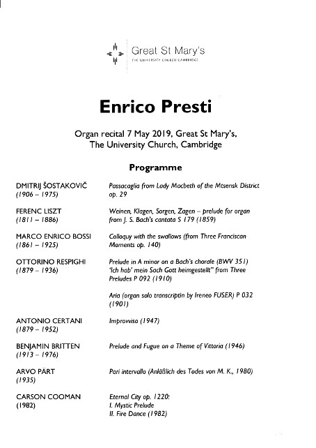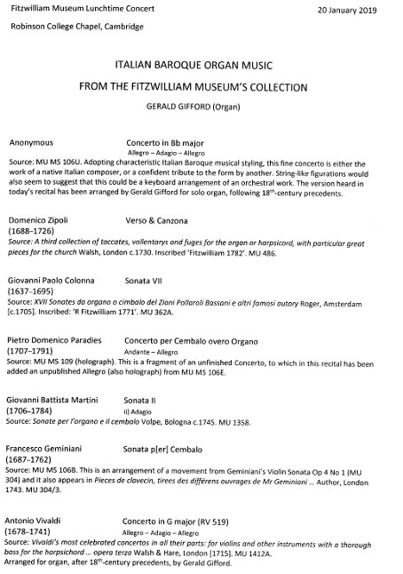 FROBENIUS ORGAN, ROBINSON COLLEGE Reviewed by ANDRE BEAUMONT On 20th January 2018 I went to listen to a recital of Italian baroque organ music on the Frobenius organ in Robinson College Chapel. The music was sourced from the Fitzwilliam Museum's Collection. The recital was given by Gerald Gifford who voiced the organ, played it at the formal opening of the college by H.M. The Queen in 1981 and at its inaugural recital. He is honorary Keeper of Music at the museum. I had not heard it before nor most of the music. It is a bright organ with no really long pipes so the organist's arrangements and registration to facilitate the playing of baroque music were appreciated. The architecture furnished an inspired way of creating an organ loft. There is little of the type of reverberation you get in a church. Most of the sound comes straight at you but it might vary depending on where you are and which way you are facing. With the sloping roof it is inevitably lopsided with something different coming to each ear though not really in timing. I only sat in one spot but angling your head could alter what you heard. High noted pieces can turn out really charming because the sound comes in a direct path to you without the intermediation of reflections. I'm mischieviously coming to the conclusion that getting an organist to help an architect tweak the acoustics of a room might be a better than using some engineering firms. There are some dreadful sounding spaces in academic buildings which end up sounding more like train stations or where you can hear everyone's conversation. This was an enjoyable concert with different music other organists might like to explore. Programme front page ___________________________________________________________________________ On 7 May 2019 I attended another unusual programme of music at a recital by Enrico Presti given on the Parish organ of Great St Mary's. Programme front page When there is precision of resonance from an organ there is something that feels health giving about it; others have said the same about good audio equipment but this is unamplified live music. Our brains probably measure time interval very accurately and when you also vibrate to the sound there is something added. I was impressed by Enrico Presti's registration, bringing out of the lower registers of the organ and precision of playing that made this the most enjoyable recital I have heard on this organ in the past two years. It is not emotion this time - everyone has their own style - it was that the sound was right, the air was right and the reviewer was suitably rumbled and rattled in his pew, which is not always the case with this organ. The first composition may be a little hard work listening to, not because of the organist, but from the second I was captured, particularly by the resonance of bass notes. Two of the compositions may be based on Bach but this was nothing like baroque music; composition runs from 1859 to 1982 and suited this organ. The Ferenc Liszt, Bossi and Certani I was particularly impressed by. Leaving Great St Mary's lunchtime recital ___________________________________________________________________________ To conclude I thought I would go to listen to Stephen Farr again at the evening recital on 25 November 2019 at Christ Church Spitalfields. ![]() Old 120 film snap In the early eighties I used to be a Friend when it was in terrible condition inside and a little under threat. Certainly, there was no functioning organ and it would have been dangerous to let the public in. The quality of the internal finishes visible now as a result of restoration is astonishing. It is one of the Grade I listed jewels of English architecture. We met another Friend on the steps at the time, a Lloyds underwriter, and as result I was invited to write a review of the Lloyd's Building, recently opened, reproduced marginally changed on World Reviews, now also Grade I listed. At the time, I was the only one who described it as revolutionary for English architecture. Wonderfully, it has not been subject to disfiguring modifications and there are always City people game for preserving heritage. I like Boris buses; I find the design elegant but mine was held up by the new prime minister's car coming the other direction so I arrived 5 minutes after the start of the recital. The photo of Stephen Farr at the organ was hastily snatched from then. The organ was rebuilt in 2015 with many new pipes and he is one of the best at bringing out an organ's capabilities as he did in a varied programme. I was hoping to get round more of Cambridge's organs during the year. He played Walther's Concerto del Sigr Torelli here at Spitalfields in a recital spanning 8 composers but if you would like to hear him play on the organ of Clare College there is a recording of him playing Walther there. |