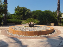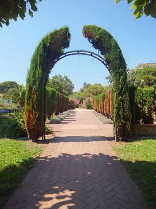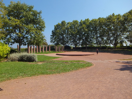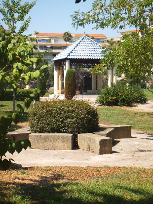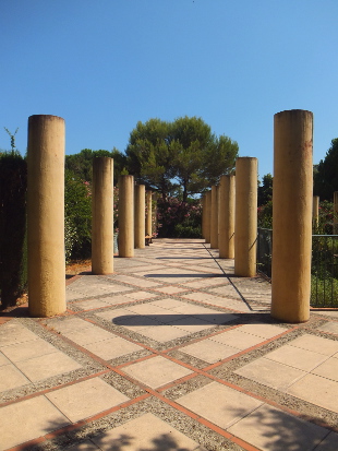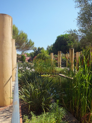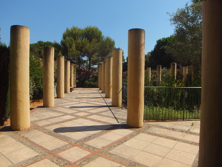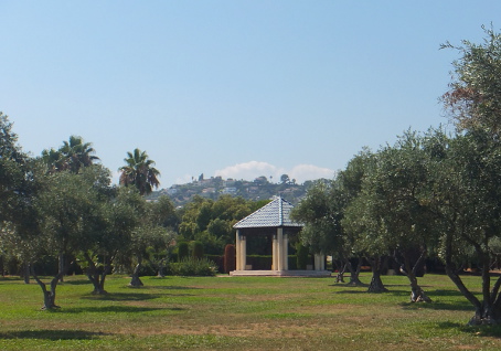 PARC EXFLORA Reviewed by ANDRE BEAUMONT Temple in the olive grove Sometimes you need an open space to prevent one town sprawling into another. This is particularly so on a littoral where progressive ribbon development is always a possibility. Parc Exflora lies between Golfe Juan to the west, where Napoleon landed after his exile on Elba, and Juan-les-Pins to the east and performs the function very well and with some aesthetic delight. To the south lies the coast railway, which can be crossed by a bridge, a road and then the Mediterranean. To the north it is bounded by six storey blocks of flats, a sensible height. It is, of course, a formal garden and has to survive some natural water shortages. The influences are global, across time and diverse.... and delivered pared and attenuated to make them contemporary. The criss-cross square grid-bound citrus grove opens out effortlessly into the curves of an amphitheatre.... ....which turns the right-angle for you over a bridge.... ....saving you heading for the Mediterranean straight across a railway line. Another long vista does lead somewhere, past the obelisk, through the arch.... past multiple features to what brought Worldreviews back to this garden after two years.... ....an attenuated peristyle where the criss-cross square grid finds resolution in a 'temple' round a lily pond. Olive green frogs in the 'temple grove' |