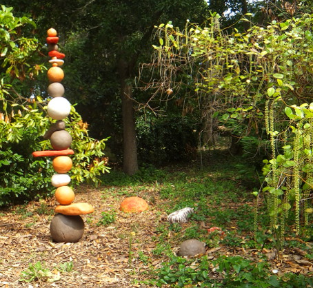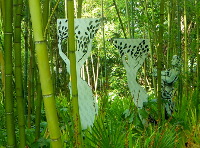 JARDIN THURET Reviewed by ANDRE BEAUMONT Villa Thuret is a plant institute where the plants do not get it all their own way. They get hung out to dry. Those who live in glasshouses shouldn't .... It is war between the species, too, as it is a station for the study of entomology and also one for researching the acclimatisation of exotic species. Villa Thuret also has a wonderful, extensive botanical garden and holds a national collection of Mediterranean tree species. No gatekeeper intrudes here and the gardeners are so well acclimatised that only one was spotted, wheeling a wheelbarrow like sweet Molly Malone, on the opening day of a major sculpture exhibition, hosted by INRA, as intellectually stimulating as any I have visited this decade. The theme was acclimatisation and seamlessly integrating as if 'no-made' (not made) but natural. Commercial shows can be sterile, reflecting little and supping scantily from the primaeval soup of culture, so we hope this one will be catalogued to do justice to the artists. It's a prickly contrast. Just maybe, when historians want a different perspective of what happened in the first decades of the millennium they will come here. Scary stuff! So ephemeral in this garden, even the liquid. We're missing some. For want of a good photograph. Oh, keep le gardien far hence, for with his fork he'll dig it up again. Singing swing low sweet chariot. So the Nomade rolls on and it's time to steam away like a Homburg on the sea. ***** No one can say that I do not encourage cross-pollination of ideas between the places I frequent. [1] In December 2019 Worldreviews will be 20 years old. It occurs to me that for most of that time I have attended a sculpture show biennially, Sculpture in the Close, in the grounds of Jesus College, Cambridge. Slowly, over a decade and a half, the twin towns between which Villa Thuret finds itself, Antibes and Juan-les-Pins, have also become known for their summer sculpture exhibitions. Botanical gardens and grounds where you can check entry to ensure the security of exhibits are ideal places to show some types of sculpture and, if you could do with the visitors in these days when so many towns compete for cultural importance, even better. So perhaps Villa Thuret should think about having biennial exhibitions to follow the first in 2018. Sculpture in the Close |