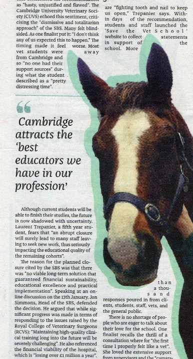 With the science available to the Cambridge University Veterinary School it would be impossible to kidnap Shergar and significantly profit by it other than from the ransom sum. Progeny? Forget it - they would be easy to trace. We have a whole industry in Newmarket that needs the school open but long professional courses are easy targets for closure because they necessarily spend less time producing research papers and much more on inculcating practical skills. Government funding follows research more than practical development though. Government has for too long grouped research with development but they are quite separate strands today - Britain is still brilliant in research but near useless now in development. Practical disciplines, like veterinary science, stitch the two back together naturally. The science of LEDs was down to Cambridge but the hard work of development was put in by South Korea producing a world leading screen industry. Britain generally now eschews the hard work of development. These closures of practical disciplines have some history of not happening at Cambridge University - some years ago the Department of Architecture was due for scaling back but that did not happen. Architecture and veterinary science are the professions with the longest academic training and, in practice, the broadest overview because they must have enough knowledge of all the sub-disciplines they use, like civil engineering and pharmacology, to not let these pull the blinkers over their eyes. At the end of the day they must ensure a vet school is on sound ground and the animals of sound wind whichever way the wind of the day blows. So that offers some hope for the vet school. |