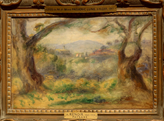 RENOIR MUSEUM Reviewed by ANDRE BEAUMONT ![]() The Renoir Museum is found in his last home in Cagnes-sur-Mer, near Nice, and designed for him by an architect in neo-Provençal style on farmland he acquired around 1906 to whose centennial olive trees he was attracted. The parkland can make it a pleasant day out for visitors. ![]() The south elevation shows the dropped floor level of the studio within - where he painted with some difficulty and often with assistance as he had rheumatoid arthritis. ![]() The first floor has related painting seeking to give context to his life here and the basement floor contains sculptures produced in collaboration with Richard Guino but this review focusses mainly on showing the paintings attributed as in his own hand, at the museum in 2025. ![]() ![]() Pierre-Auguste Renoir and Richard Guino, Madame Aline Renoir, 1916 ![]() Roofs of Nice Old Town from a window in Nice, 1918 ![]() Portrait of Madame Pichon, 1885, loan from Musée d'Orsay ![]() Young Woman at the Well, oil on wood, 1886, loan from Musée d'Orsay ![]() Seated Nude, 1895, loan from Musée d'Orsay ![]() Les Grandes Baigneuses, 1903 - 1908, loan from Musée d'Orsay ![]() Coco Reading 1905, loan from Musée d'Orsay ![]() Portrait of Madame Colonna Romano, 1910, loan from Musée d'Orsay The Impressionism has declined from Place Clichy, which invites the brain to fill in so much, to Madame Romano, which has distinctly classical references and by which time he would have been resident in the house here. Then you come to paintings done in the locality or possibly so. ![]() The Cagne Valley and Saint-Jeannet, 1905 Having seen the valley no later than 1905 he bought the Collettes farm in 1906, which you can see from the house a hundred metres away, and which is in the 4 hectacres of the park. Aline Renoir, however, wanted to live in a house so it was built in 1909. ![]() The Collettes Farm, 1910 ![]() The Collettes countryside, c.1910, loan from Musée d'Orsay Though one of the last two is given as being from the period he was living here I would have doubt as to them having been painted here. You do not get such woods or fruit hereabouts. ![]() Walk in the woods, around 1910, loan from Musée d'Orsay ![]() Still Life of Apples and Almonds, undated, loan from Musée d'Orsay |