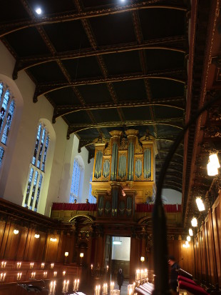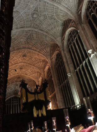 ACOUSTIC EXPEDITIONS: ORGAN MUSIC 2020 Reviewed by ANDRE BEAUMONT King's College Chapel fan vaulting from the rearmost row of pews We have storm Dennis assailing Britain as I start this review. 30 metre high waves are forecast for the North Atlantic. A tailwind pushed me past the pineapple exhibit outside the Fitzwilliam Museum on the way to an organ recital by Simon Bell at King's College Chapel, Cambridge on 15 February 2020. Architectonic Pineapple by Bompas and Parr on an unstormy day At the side of the Chapel there was lots of wind shear but once inside there was calm, which does not mean silence. In mediaeval times when homes were mainly less sturdy it must have been reassuring to take refuge from a storm in the immense solidity of a building like this. Of all Gothic buildings I would hazard that this is the one with the most glazing in close proximity to a congregation by virtue of its late Perpendicular style, of which it is the apogee. Dating from completion of the Chapel in 1515 to 1531, the stained glass windows are mainly Flemish in execution and the tracery more slender than before. Adoration of the Magi by Rubens, which arrived in 1968, is rarely seen these days I do think the air has to be right to add to the excellence of an organ recital. Glass transmits sound and resonates too. On a night like this the air pressure outside, assailing the windows, is met with the force of the organ's resonance coming the other way and what is reflected back at you changes pitch and complexity. The further you sit up the nave the more the high notes bounce at you off the windows, going beyond tertiary reflections and merging into a hybrid sound, a ringing, that takes you beyond what can be identified as notes. Then there are the infrasonics of 32 foot pipes that go down to nearly 16Hz which you hear through the backs of the rearmost pews or the flagstones if sitting further forward, added to which are the audible sounds and the infrasonics of the wind. It is reflections off glass and off the diffusing hard surfaces of the largest and best of fan vaults that add to the crystal clarity of voices recorded here. Microphones cannot, though, record the full glory of organ music or its full complexity. Over 280 volatile compounds have been found in pineapples. So when someone says this wine smells of pineapple (or, indeed, another fruit) I have to do a double take and see if I can recognize what must be one or two of the compounds. I personally no more choose to describe wines in terms of fruits than would describe pineapple as smelling like wine but I accept that one needs to strive for a language. Organ music is full of auditory complexity. It has been said that writing about music is like dancing about architecture, which leaves me stuck, but I do know I can write about architecture and this suggests where this review will go over the course of the year as I attend more organ recitals. So Simon Bell made me listen better. He made good use of the throaty depth and volume of the organ with precision. The air was fairly good and, certainly, with more sounds in it. From where I was sitting I could almost 'see' how some of the reflections were coming because they were multiple (in fact hear and then measure angle, as a cat can by moving its ears!) so happened to learn how to listen better and will do so at future recitals. The programme was Hollins Concert Overture in C minor, Vierne Symphony No.2 in E minor - ii Chorale, iii Scherzo, Leighton Prelude, Scherzo and Passacaglia, Op.41. It is the Louis Vierne 150th anniversary year so I hope to attend more organ recitals associated with that. ***** On 23 February 2020 I went to a recital at Trinity College Chapel, Cambridge. Listening I think the Metzler organ the best I have heard in Cambridge. It was not considered so by critical opinion when it was installed but cultural tastes have become more European. The chapel's acoustic is not an easy one to describe and by my take is much about ambient sounds and social spaces, as is all of Trinity to the Backs. The chapel's hammerbeam roof damps sound where the fan vaulting at King's both reflects and diffuses it, which does not necessarily flatter the Metzler. The architectural space at Trinity is much less complex though mediaeval too. The pay off is in accompanying services and in particular when there are a lot of people processing, or coming, in an out. It sounds absolutely glorious when ambient sounds add to the complexity. The recital given by Jonathan Hope - Bach Fantasia and Fugue in G BWV542, Vierne Intermezzo Symphony No.3, Op. 28 and a Mendelssohn Prelude and Fugue - were near flawless in execution. There is relatively little vibration from the organ through the furniture or floor. The acoustic is different for three parts of the building. At the east end, where there is the altar, it can be hard work on the human voice as there are too many reflective surfaces. The ante-chapel, where you would not normally be in a service, has its own acoustic - quite nice when used as a social space. The central space, with its high panelling, pews, overhead hammerbeam and pleasant width - not too close and not too distant from those opposite - where most services, performances and listening to the organ would take place, is a location which I have grown to identify as characteristically Trinity. There is less sound reflection here. No voice either speaking or singing dominates here though it can be heard if it is intended to be. That is Trinity through and through - quality in depth and breadth but no dominance. It is a good social space. It is generally good for singing in, too. I stayed on for the service. The choir, which used to be an also ran to King's and Clare, is now rated fifth best in the world. I loved their Gerald Finzi anthem Lo, the full, final sacrifice (1946). The most enjoyable was at the end. You heard the rustle of people filing out of the wooden pews - it sounds better here than most plac