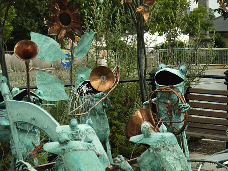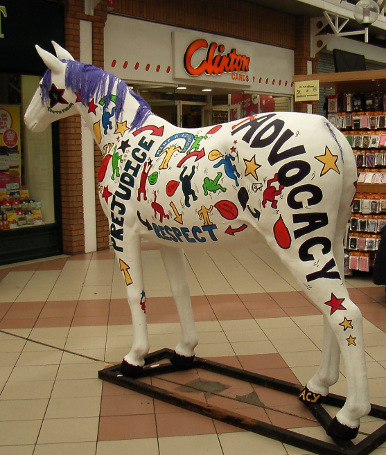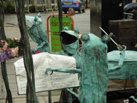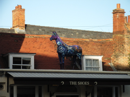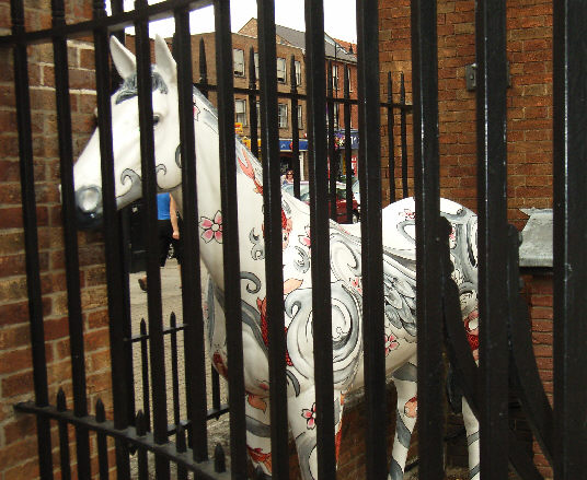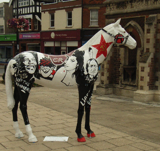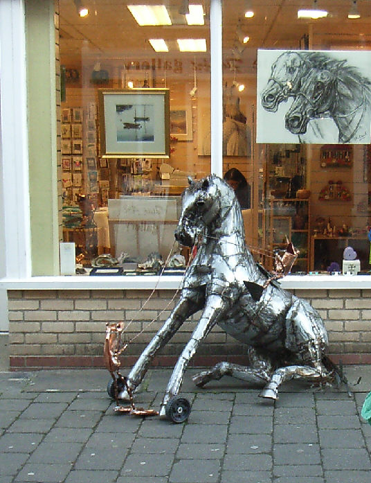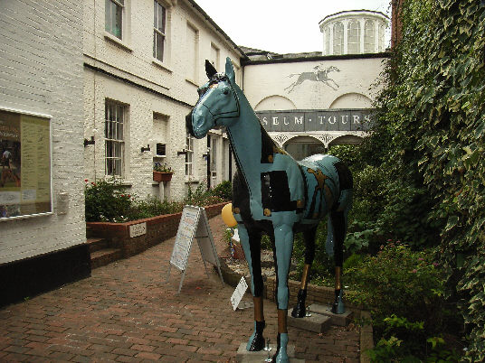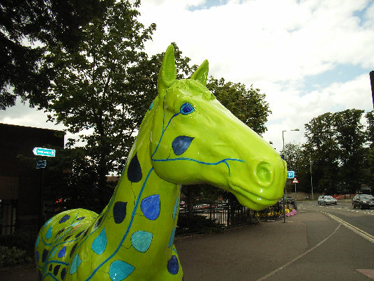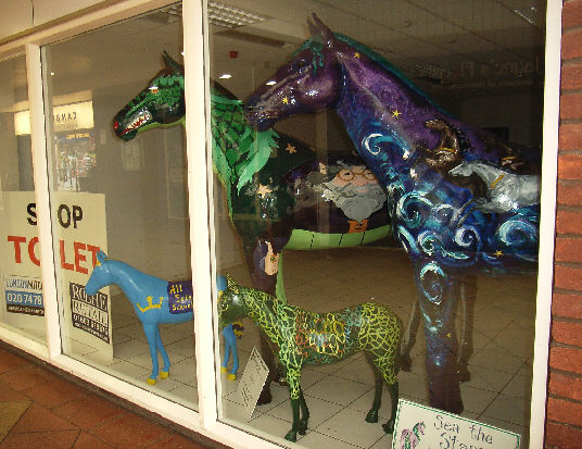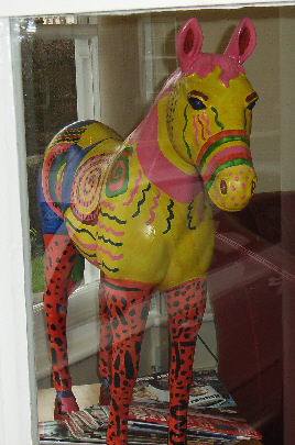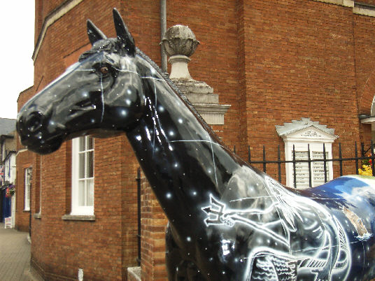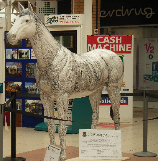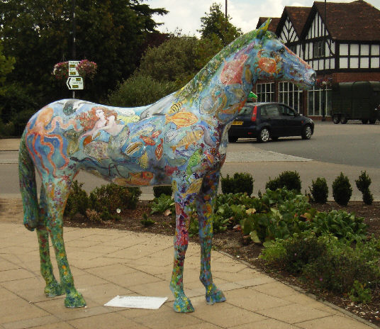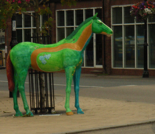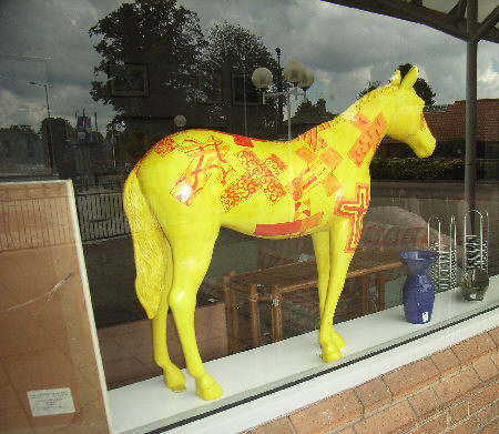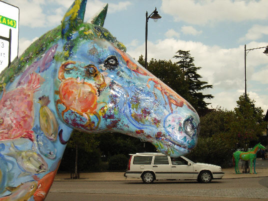 HORSE ABOUT NEWMARKET 2011 Reviewed by ANDRE BEAUMONT Sometimes something ephemeral needs recording because it captures part of the spirit of a place and just in case too few others archive the event. ![]() Ten Winners in Blue by artist Jilly Cunningham at the National Horseracing Museum The arrival in Newmarket in mid-2011 of thirteen lifesize painted and lacquered fibreglass horses and sixteen smaller horses, handsome creatures all for moulded fibreglass, and which remained present there for many months, was a cause of much joy around the town. ![]() Sea The Stars by Stuart Roy at the Jockey Club In spare moments people searched them out around the town, sometimes milling around them but always politely stepping out of the way to let other look at the detail. ![]() Shadeed by Kirsty Sharman looking through the Jockey Club railings at Sea The Stars These photographs, hurriedly taken when no one else was in shot on a cloudy day, with no intention of publication, do no real justice to the detail in the art. (For example, in the waves of Rachel Drury's horse below are five horses I've watched win the Guineas: Mark of Esteem, Zafonic, Mystiko, Nashwan and Doyoun.) ![]() Esther Albone's Wizard (left) and Rachel Drury's Sea The Stars with two small horses. For that, search out internet photographs and accounts or, better still, the souvenir brochure, Horse About Newmarket 2011, that accurately and widely apportions credit for this town-wide effort in creating community art. ![]() Interpreter by Emily Jarvis in the Guineas shopping arcade Newmarket has never been a siloed town where everyone retreats into their own lives - the shared culture of the horse is too strong - and this art just proved it all the more. ![]() Cockney Rebel by Chris Winch. Looking for a trough by the drinking fountain? The brainchild of a town councillor and brought to fruition by the town council's events manager, the event held a competition for designs to go on the horses based on the names of 2000 Guineas winners. ![]() Jeremy Tree trained Only For Life by artist Jac Butt with a tree of life growing up him The local artists whose designs won became the painters of the thirteen horses. ![]() Jacquie Jones' Atlantic ![]() The sixteen small horses were painted in local schools and by youth organizations and charities. Some of these ended up in unusual places and they moved around the town during the summer. The first pair I saw were in the window of wine merchants, Corney & Barrow. ![]() Kevin Yarrow's Nectar just off the heath and mystified how to cross a roundabout The horses went to the Guineas Festival, then to a Gala Evening on the Severals on Thursday 16th June where the overall winner Interpreter by artist Emily Jarvis, the first runner up Sea The Stars by Frances Wray (one of three entries called Sea The Stars), and second runner up Wizard by Esther Albone, were selected. ![]() Moulton CEVC Primary School horse looking large in a shop window close up The small horses also had a trip on the back of a float at the annual Newmarket Festival's Carnival on Saturday 11th June. ![]() In 2012 there will be horses still for sale both at Tattersalls and here in Sun Lane The big horses were anchored down at various places around the town for the summer before most of the horses were auctioned at Tattersalls in October for the charities, Racing Welfare and St Nicholas Hospice Care. International readers of worldreviews.com should still be able to see a few of the horses about town if they come racing in 2012. ___________________________________________________________________________ 2012 Note the two bronze frogs holding the reins of the horse above. On a rather fuzzy video recording hear and see the Newmarket Bronze Frog Fountain Orchestra play awaiting the arrival of the London 2012 Olympic torch on 7 July 2012. ![]() The frog orchestra was ephemeral in this location and was removed after the Olympic torch passed through. ![]() ___________________________________________________________________________ 2014 Where are they now? Quite a few of the horses are still around the town. Some have made an appearance in The Guineas shopping precinct: A pair of ponies lived for a long time in the windows of a wine merchant. Another in the window of a bloodstock agency: ![]() Others may have taken up talent spotting themselves: Sea the Stars has positioned himself where he can see the stars, equine and celestial |