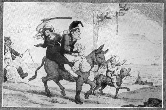 ALL THE KING'S HORSES: NAPOLEON'S HORSES AND CARRIAGES ON ELBA Reviewed by ANDRE BEAUMONT Norwood Young's Napoleon in Exile at Elba (1814-1815) was published five weeks before the hundredth anniversary of Napoleon landing at Elba and five months before the beginning of the Great War when a different nation replaced France in British perceptions as the big, continental villain. We are now nearly a full century on. Because Young is writing from a British perspective his book is less reverential of Napoleon than Paul Gruyer's Napoleon: King of Elba which broke new ground twelve years before by for the first time comprehensively drawing together all the threads of Napoleon's stay on the isle and recounting it in one history. Drawing about half from English sources and half from French and other sources, the upshot is more balance, albeit weighted to some derision and similar sentiments, and quite a lot more detail which plays to advantage if studying particular aspects like how Napoleon moved about the island. Napoleon: King of Elba with its story of Napoleon's sojourn is reviewed elsewhere on this site. This review concerns itself principally with providing some information about Napoleon's horses and carriages on Elba from Young's book which is probably no more accessible or read than Gruyer's. An English caricature of 12th April 1814 entitled: Bloody Boney the carcass butcher left off trade and retiring to Scarecrow Island (Elba) The Treaty of Fontainebleau signed on 11th April 1814 made Napoleon an independent sovereign so as Young writes: He called himself with more right than humour, "Napoleon, Emperor and King of the Island of Elba." As an independent monarch he was, in theory, entitled to complete freedom of action. So though he may have been said to have usurped a crown or as he said: "I found the crown of France lying in the gutter; I picked it up with my sword," and called Bonaparte or Buonaparte in England (and an Italian at one point by Young), following that date he probably should have been referred to as Napoleon. Certainly he had as much right to this designation as Talleyrand, formerly the Prince of Benevento, to call himself Prince de Talleyrand following the collapse of Empire. In all events he chose a British frigate, the Undaunted, to convey him to Elba, where he arrived on 3rd May 1814, in preference to a French one, for reasons of personal safety. With him came the dormeuse de voyage which he had used to travel from Fontainebleau to Fréjus. With the arrival of the Guard, which Young totals as 671 men, on 26th May 1814 came thirteen more carriages: There was the berline de voyage, in which the Emperor had made many journeys, and two berlines de ville, used by him in Paris. Of the remainder Napoleon kept two calèches in use at Elba, having them out on alternate days; one was painted yellow and red, and the other all yellow. To these were subsequently added the barouche made for the ascent to San Martino, and a calèche de chasse. Madame Mère brought from Rome a cabriolet, and Pauline (his sister) brought a low carriage and two small horses. Madame Bertrand also had a carriage. Madame Bertrand, née Fanny Dillon, was the half-sister of the marquise de la Tour du Pin (see the review Berline and Six Horses). With the Guard also came an artillery wagon and six other wagons which Napoleon used to transport building materials on the island. Of Napoleon's riding horses the Guard brought eight, listed by Young: "Wagram" was a small Arab, dappled grey, which carried him at the battle of Wagram. "Tauris" was a grey Persian with white mane and docked tail, given by the Czar Alexander at the Congress of Erfurth. The horse suited Napoleon exactly, and carried him, during the Russian campaign at Smolensk, Moscowa, and the entry into Moscow, and also in part of the retreat. On one occasion, on the 25th October 1812, when Napoleon and his staff were nearly captured by Cossacks, the speed and spirit of this horse were of great service. Napoleon rode it across the bridge over the Beresina, at the battles of Dresden, Leipzig and Hanau, in the campaign of 1814, on the march to Paris, 1815, and finally, at the battle of Waterloo. Though not as famous as "Marengo," another grey which was at Waterloo, Tauris was associated with Napoleon in all the later campaigns and battles. Napoleon Crossing the St Bernard by David, believed to be riding Marengo Another grey, familiar to Parisians, was "Intendant," a big Normandy horse, of quiet manners, ridden by Napoleon at most of his great reviews, and on ceremonial occasions on parade, such as the triumphal entry into a captured foreign capital. "Intendant" was destined to be much in evidence again in Paris during the hundred days. These grey horses became as closely associated with the fame of Napoleon as his grey overcoat and his hat. In battle pictures the Emperor is usually on the back of a grey horse. Napoleon was a master of the art of theatrical display, and would always use a grey horse when he wanted to make an impression. A horse which carried him often and well was a big chestnut "Roitelet," from an English sire and a French dam, given to Napoleon by his stepson, Eugène de Beauharnais. Napoleon at first took a dislike to this horse because at Schönbrunn in 1803, at a review, it carried him into the ranks of the Guard, causing injuries to some of the men. But during the retreat from Russia he was glad to ride it, as it did not slip on the ice like the other horses. At Lützen, when Napoleon was on its back, a bullet shot off some of its hair, which never grew again over the spot. When Napoleon visited his stables at Elba, he would look at the place and, giving the horse a lump of sugar, say: "Eh, we escaped nicely that time, both of us." "Montevideo," a bay from South Africa with flowing mane and tail, had been used in Spain. Well-mannered, this horse was reserved at Elba for Marie-Louise. "Emir," a Turk, with flowing mane and tail, had 