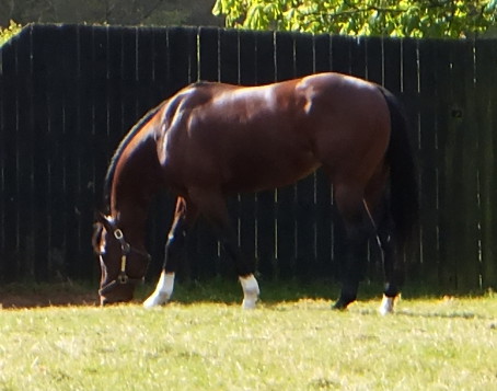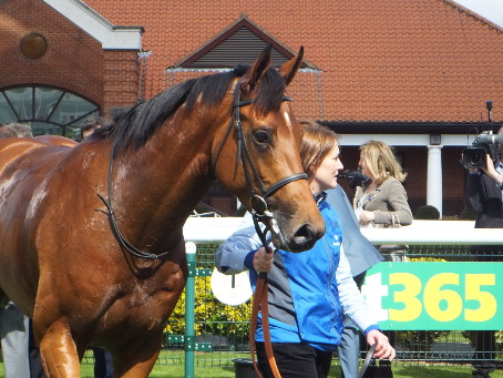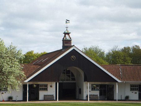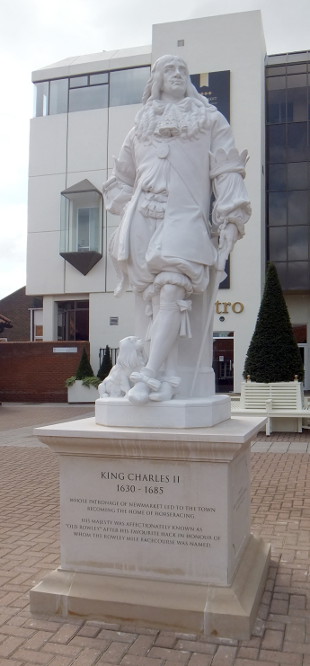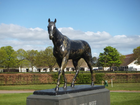 EASTER 2017 NEWMARKET Reviewed by ANDRE BEAUMONT Easter Monday is not known as a working day but the races and sales must go on and there was the breeze up on the Rowley Mile course for the Tattersalls Craven Breeze Up Sale. There was even a new statue of King Charles II, unveiled by H.R.H. The Duchess of Cornwall on 27 March 2017, which was as yet unseen by racegoers (but with only a day to go), whose spaniel is likely to be consulted by quite a few before placing a bet. Charles II, also known as Old Rowley The Rowley Mile racecourse .... with the longest straight in racing. A human athlete would not want to be running uphill here at the finish Video of Exceed and Excel colt breezing very fast on the Rowley Mile (downloadable, 17.9 Mb, 31 seconds) .... .... which sold for the second highest amount at the Tuesday evening sale, 370k guineas. Video of the only Frankel colt in the sale breezing on the Rowley Mile (downloadable, 27.7 Mb, 49 seconds) .... .... which sold for 100k guineas. Night Circus, winner of the Wood Ditton Maiden Stakes for 3 year olds run over 1 mile, the first race of the Craven meeting on Tuesday Sculpture of Mill Reef at the National Stud The National Stud - which is adjacent to the July Course Toronado, who stands at the stud - he goes to Australia in the winter |